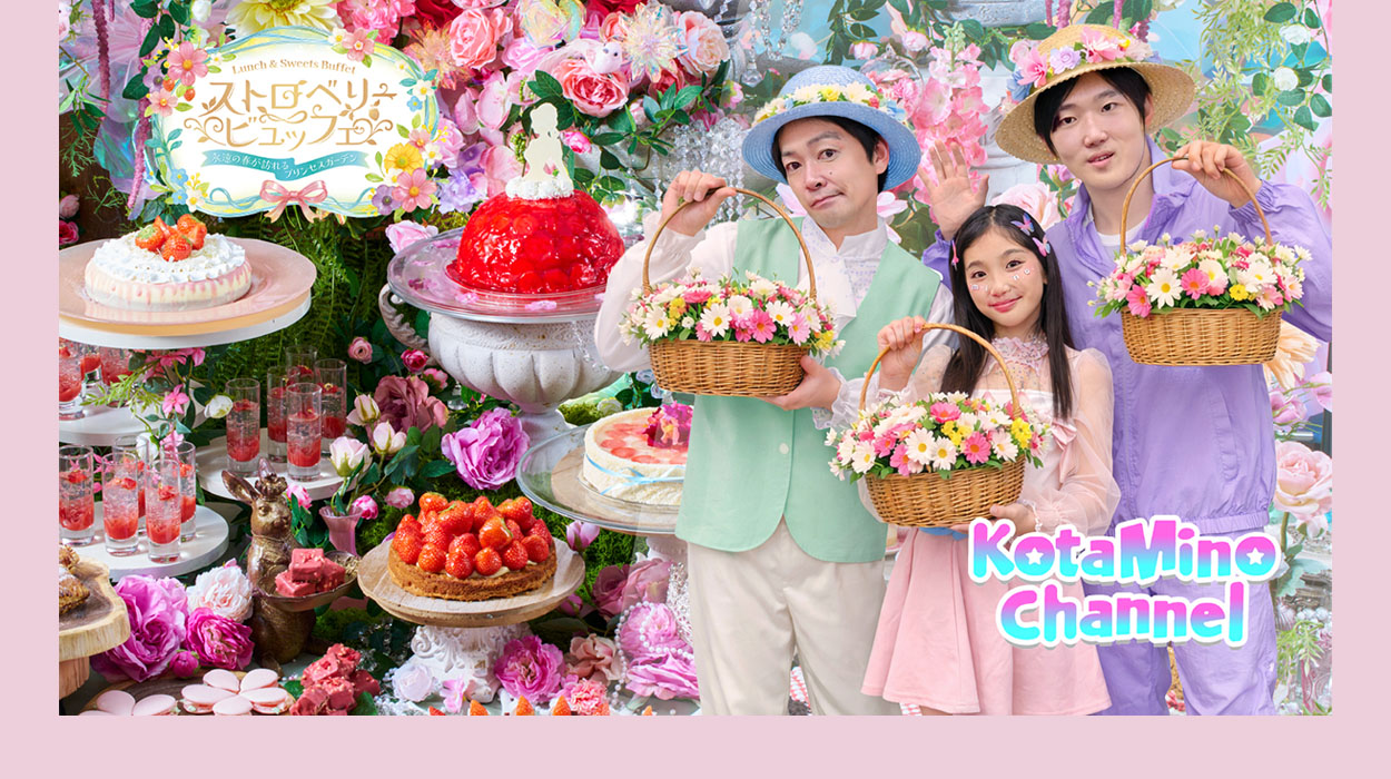 今回は、レストラン「マティーラ」で大好評開催中の『ストロベリービュッフェ ~永遠の春が訪れるプリンセスガーデン~』を会場に、ランチ&スイーツビュッフェを楽しみながら、こたみのファミリーと特別な時間をお過ごしいただけます。こたみのファミリーとの記念撮影、ゲーム、そして一緒に歌って踊れるミニステージなど、ここでしか味わえない楽しいプログラムをご用意しています。